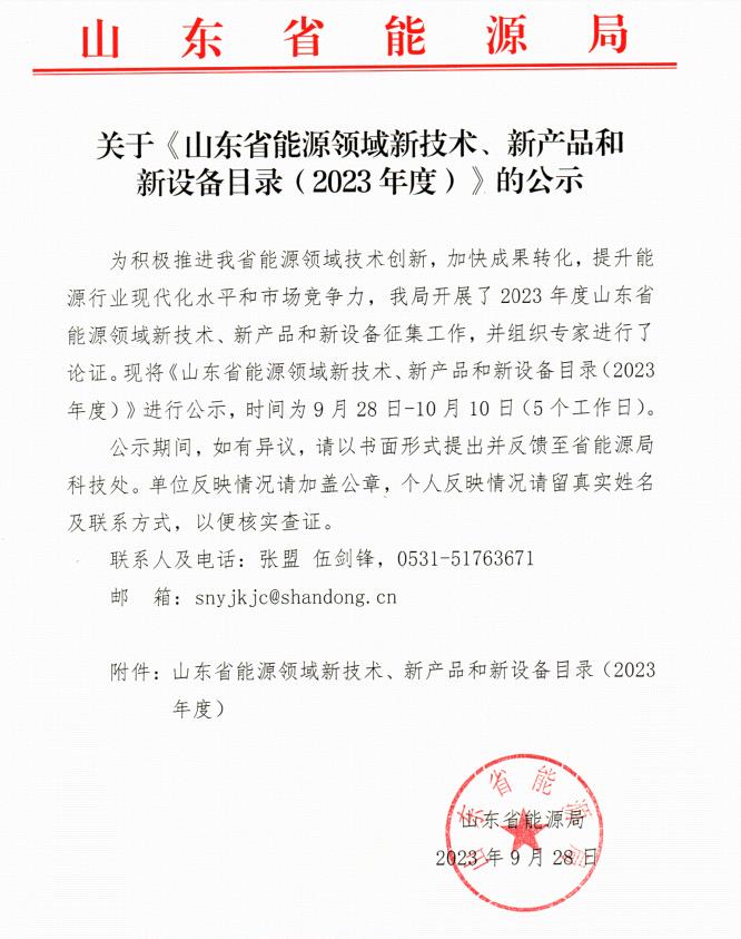 關(guān)于《山東省能源領(lǐng)域新技術(shù)、新產(chǎn)品和新設(shè)備目錄(2023年度)》的公示